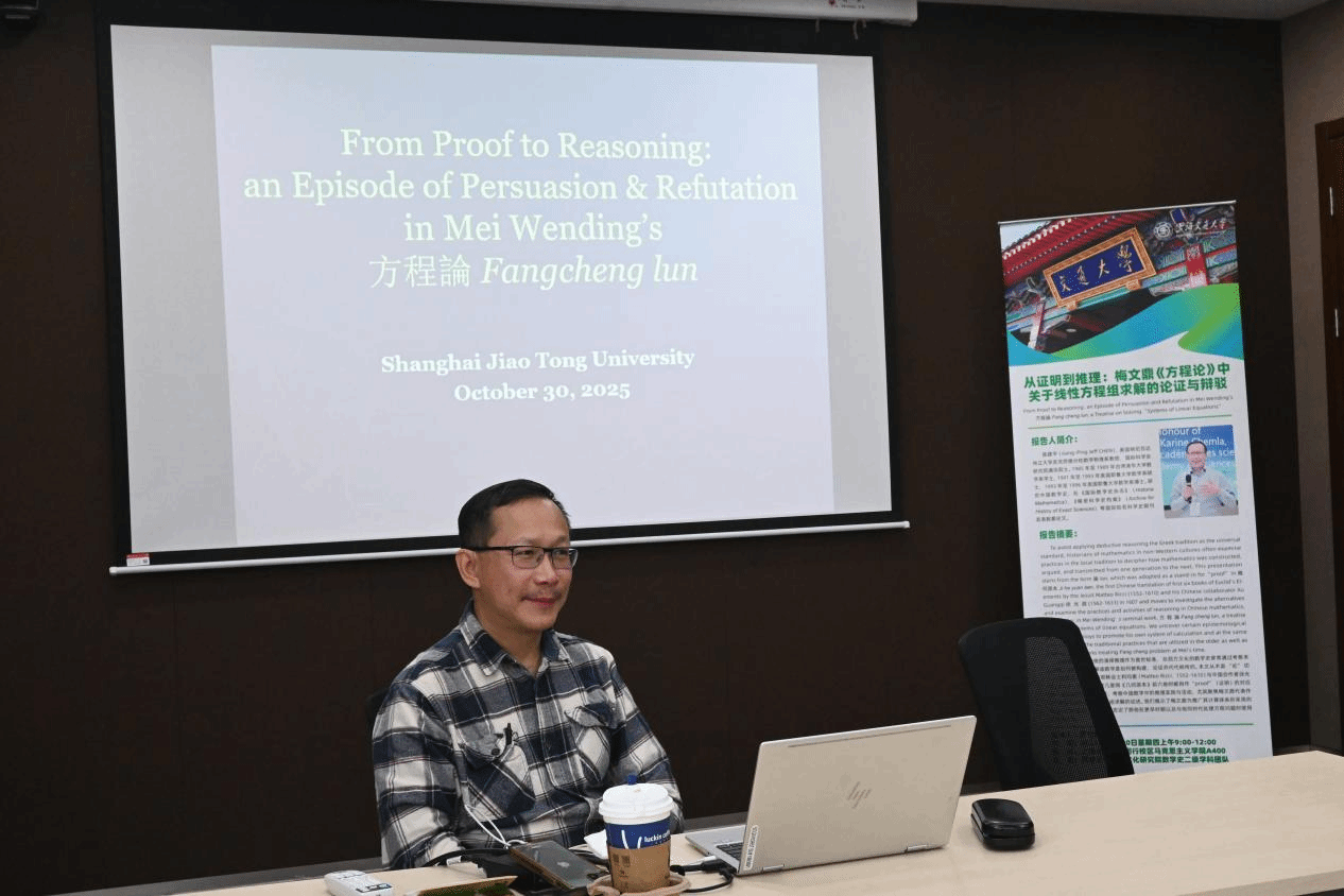 2025年10月30日上午,上海williamhill官网“国际学术交流月”第二季活动持续推进。美国明尼苏达州立大学圣克劳德分校陈建平(Jiang-Ping Jeff CHEN)教授应邀,进行了题为“从证明到推理:梅文鼎《方程论》中的论证与辩驳”(From Proof to Reasoning: an Episode of Persuasion & Refutation in Mei Wending’s 方程論 Fang cheng lun)的讲座,讲座由萨日娜教授主持。
